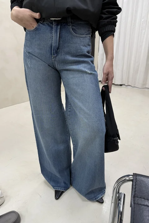 Lavado azul matizado con pequeñas roturas en delantero, bocas de bolsillo y ruedo.