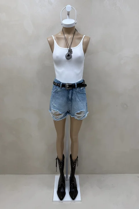 Short tiro alto. Lavado celeste con roturas en el delantero y bolsillo trasero. Con ruedo desflecado.