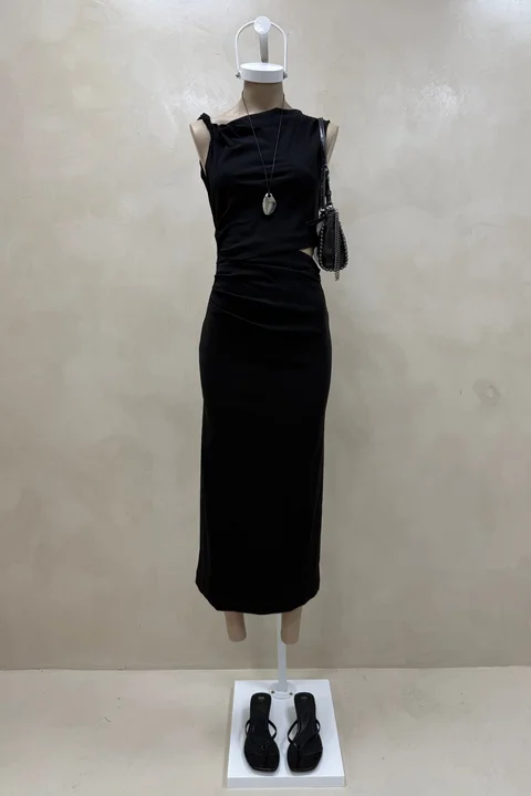 Vestido largo asimétrico con torsión en un hombro.